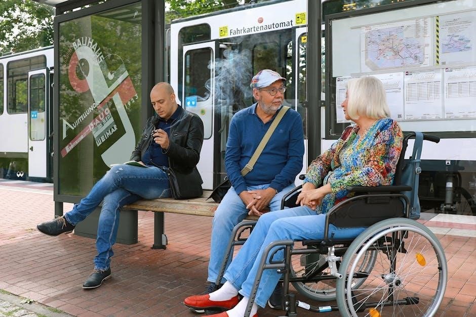 The 319 bus schedule PDF ensures accessibility for disabled passengers by providing wheelchair ramps‚ priority seating‚ and audible announcements. Buses are equipped with low floors and securement systems for mobility devices‚ while schedules include large-print options for visually impaired riders‚ ensuring equal access to public transportation.
